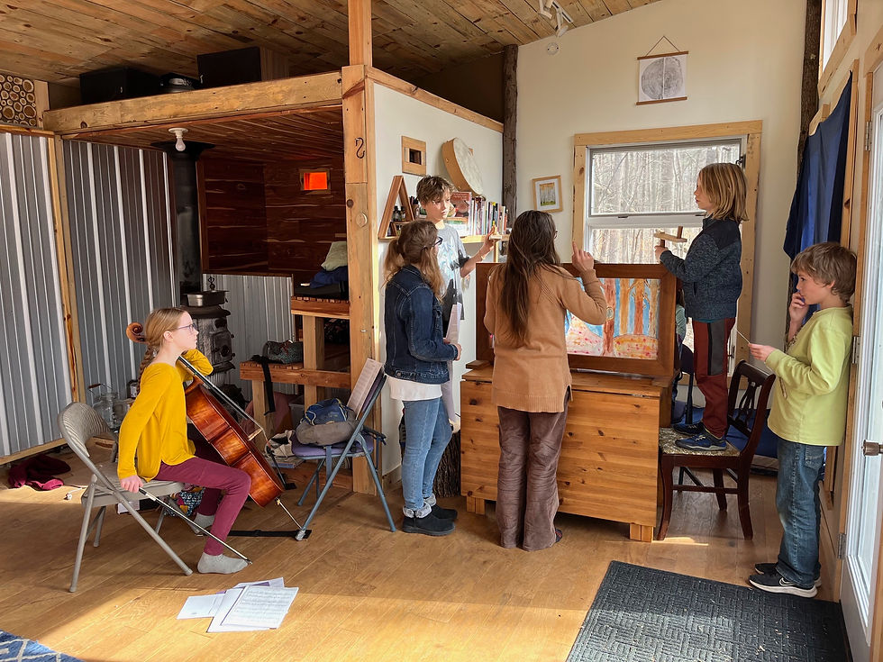 Soulcraft Bloomington creates intergenerational community through nature connection, folk arts, and traditional healing arts. Both of our crankies were created by local folks during Winter classes- an adults only Crankie class, and a kids Crankie class. We create crankies each year and perform them around Bloomington each early Spring!